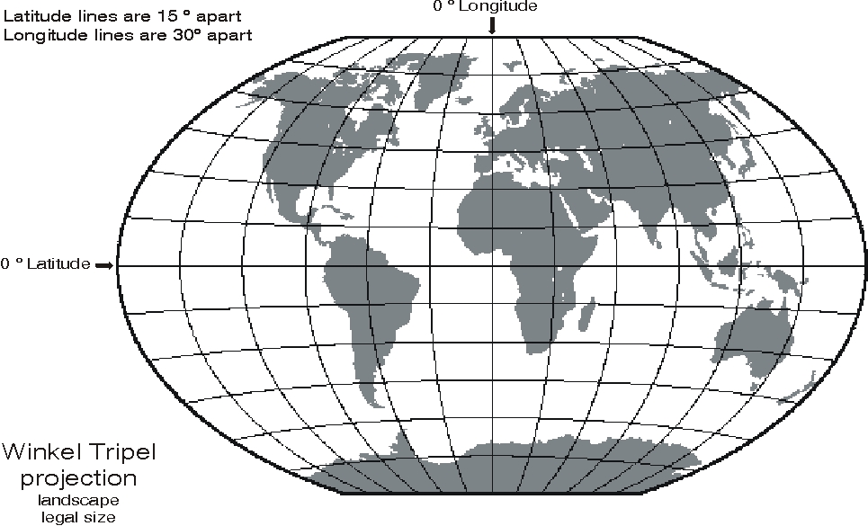 You will need a map you can place on a desk or table to draw lines on. Here are two simple drawings of the Winkel Tripel map - one for 8 1/2 X 11 letter size paper, and one for 8 1/2 X 14 legal size paper.